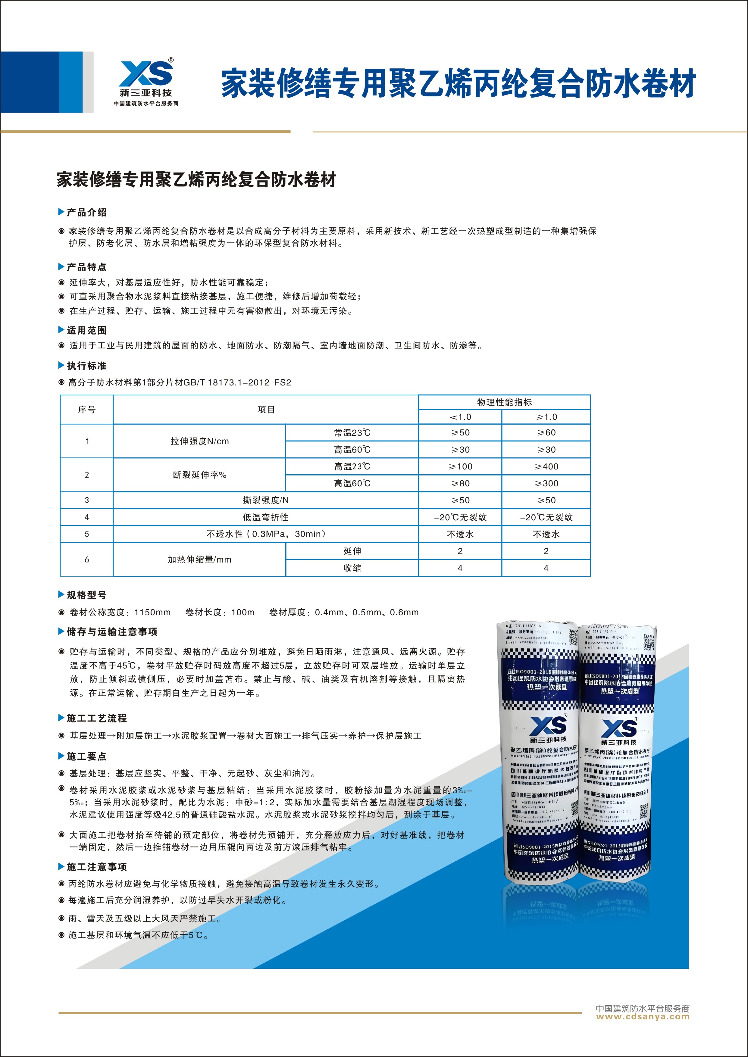 產(chǎn)品簡介: 乙烯丙綸復(fù)合防水卷材是以合成高分子材料為主要原料,采用新技術(shù)、新工藝經(jīng)一次熱塑成型制造的一種集增強保護層、防老化層、防水層和增粘強度為一體的環(huán)保型復(fù)合防水材料。 規(guī)格: FS2-PE-0.6mm 1.15m×100m | ![]() | ![]() |