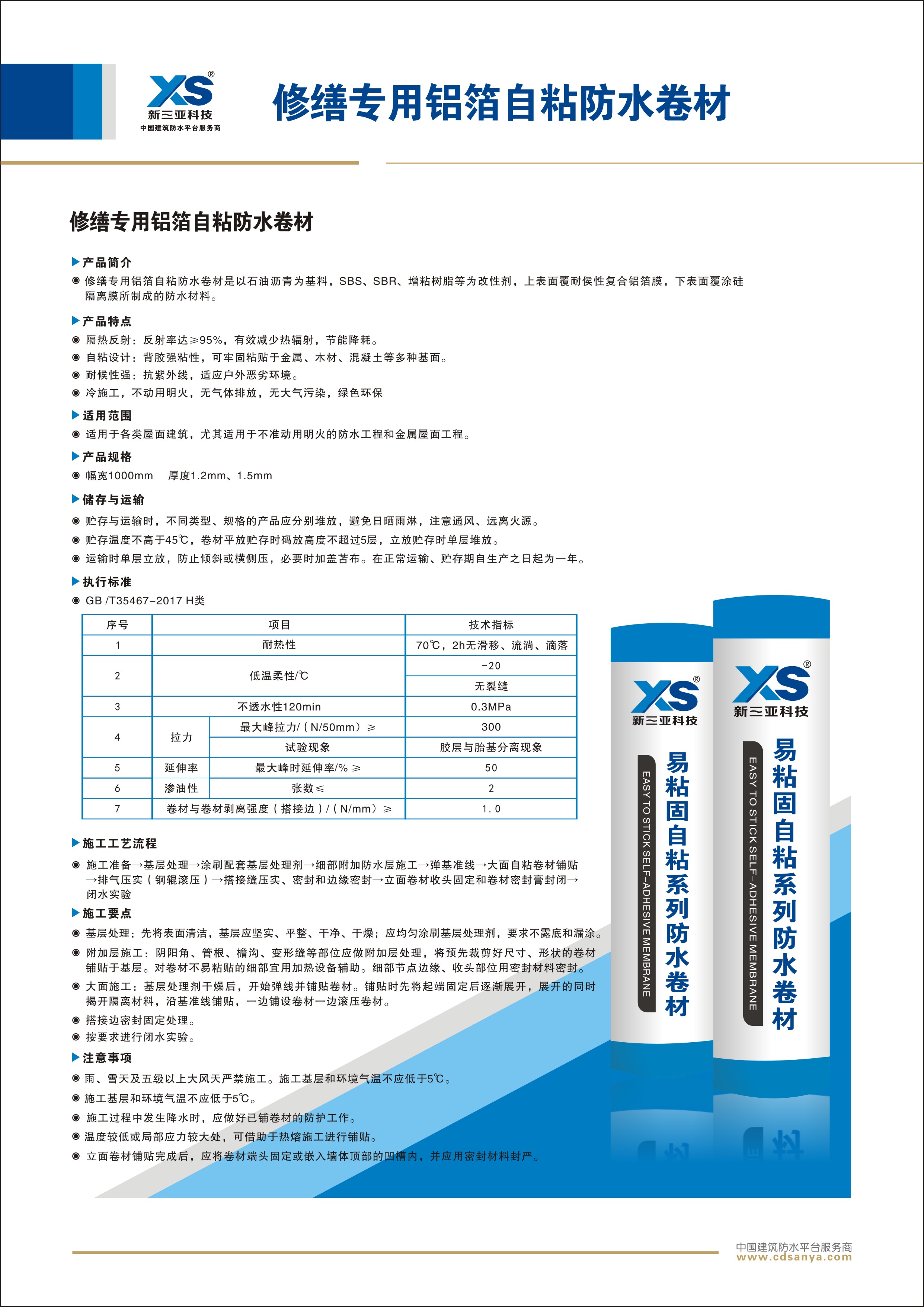 產(chǎn)品簡(jiǎn)介 修繕專用鋁箔自粘防水卷材以石油瀝青為基料,SBS、SBR、增粘樹脂等為改性劑,上表面覆耐侯性復(fù)合鋁箔膜,下表面覆涂硅隔離膜所制成的防水材料。 規(guī)格:1.5mm 1m×20m | ![]() |